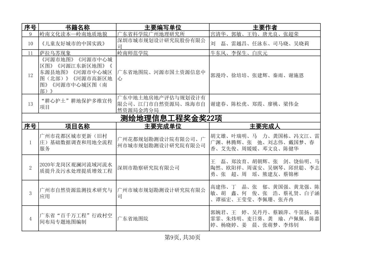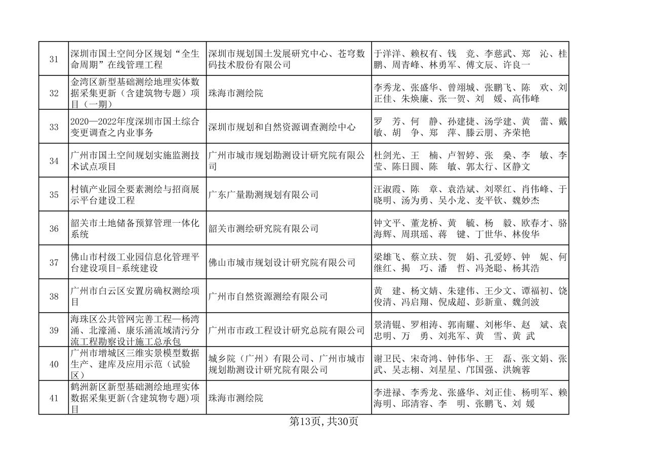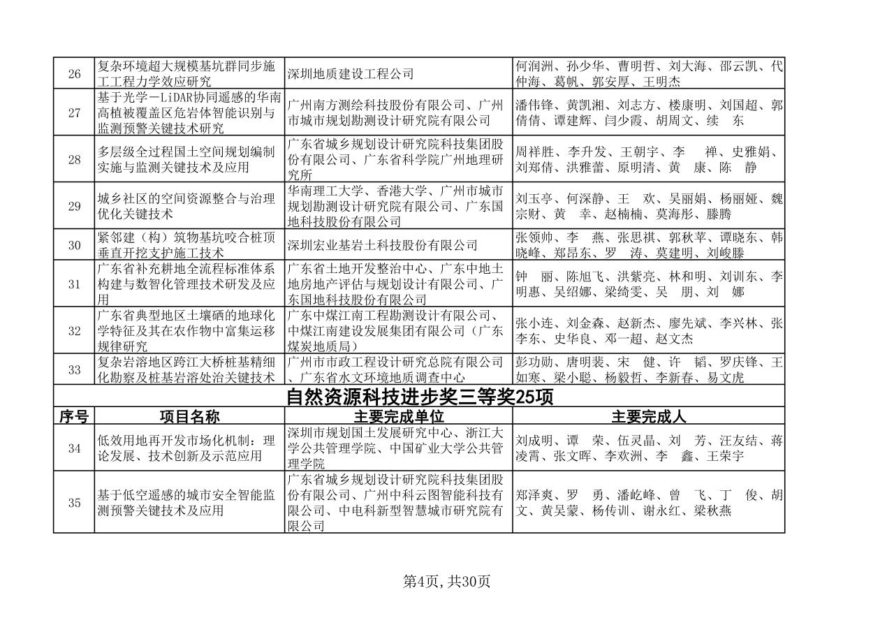 金粤自然资源科学技术奖励办公室根据《关于开展2025年度金粤自然资源科学技术奖评选的通知》(奖励办〔2025〕1号)、《金粤自然资源科学技术奖励办法》有关规定,对申报的141项自然资源科技进步奖、19项自然资源科普奖、39名自然资源青年科技奖、148项测绘地理信息工程奖、174项规划设计成果奖的项目(人选)进行严格审议,秉承客观、公平、公正的原则,推选出自然资源科技进步奖一等奖13项、二等奖20项、三等奖25项,自然资源科普奖一等奖4项、二等奖4项、三等奖5项,自然资源青年科技奖16名,测绘地理信息工程奖金奖22项、银奖34项、铜奖42项,规划设计成果奖金奖23项、银奖30项、铜奖47项。现予以公示(详见附件)。