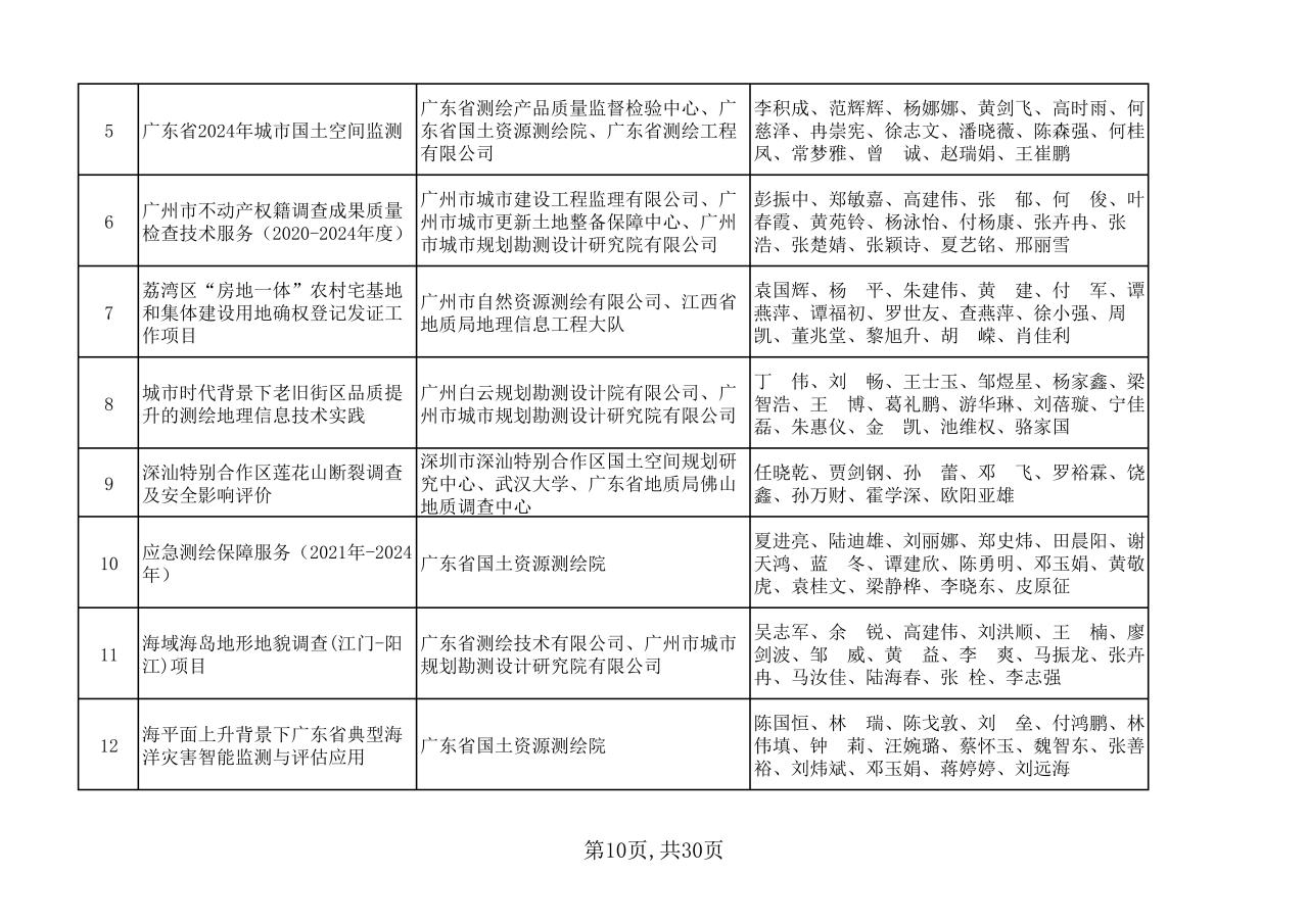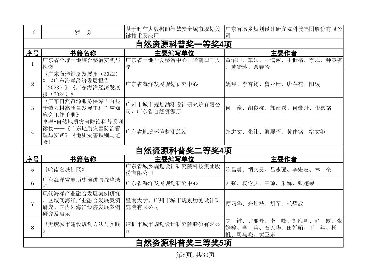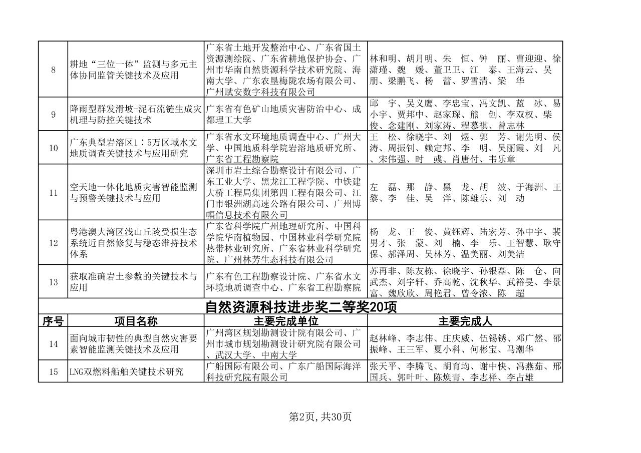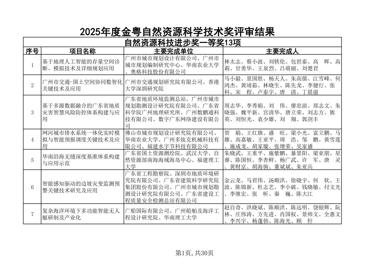 金粤自然资源科学技术奖励办公室根据《关于开展2025年度金粤自然资源科学技术奖评选的通知》(奖励办〔2025〕1号)、《金粤自然资源科学技术奖励办法》有关规定,对申报的141项自然资源科技进步奖、19项自然资源科普奖、39名自然资源青年科技奖、148项测绘地理信息工程奖、174项规划设计成果奖的项目(人选)进行严格审议,秉承客观、公平、公正的原则,推选出自然资源科技进步奖一等奖13项、二等奖20项、三等奖25项,自然资源科普奖一等奖4项、二等奖4项、三等奖5项,自然资源青年科技奖16名,测绘地理信息工程奖金奖22项、银奖34项、铜奖42项,规划设计成果奖金奖23项、银奖30项、铜奖47项。现予以公示(详见附件)。