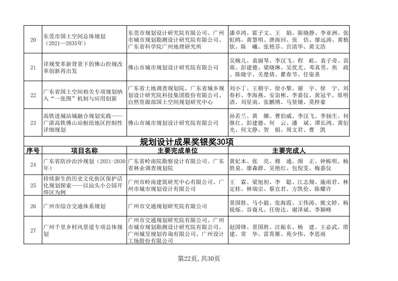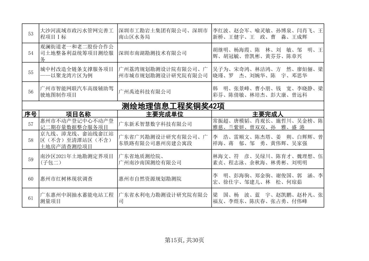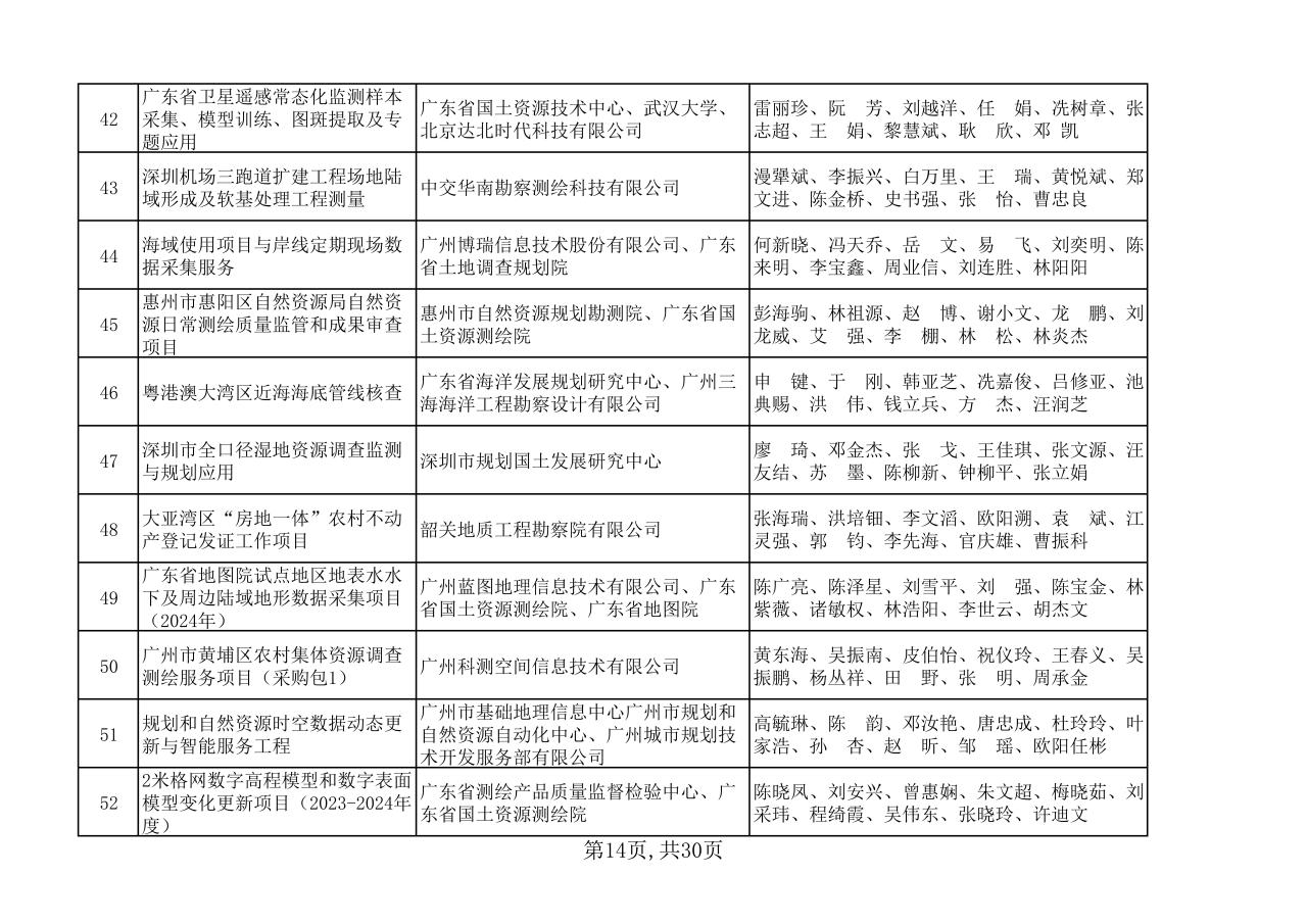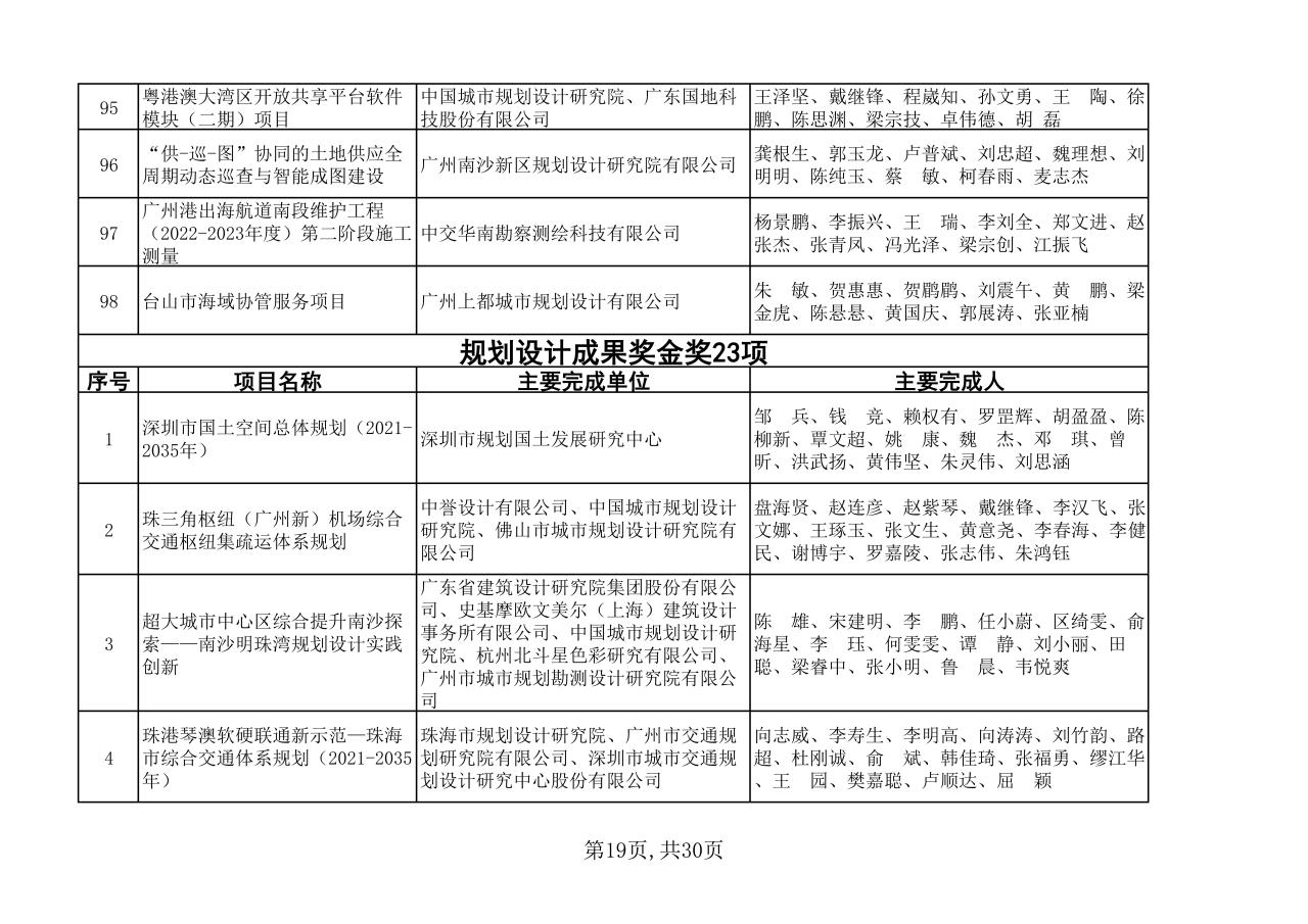 金粤自然资源科学技术奖励办公室根据《关于开展2025年度金粤自然资源科学技术奖评选的通知》(奖励办〔2025〕1号)、《金粤自然资源科学技术奖励办法》有关规定,对申报的141项自然资源科技进步奖、19项自然资源科普奖、39名自然资源青年科技奖、148项测绘地理信息工程奖、174项规划设计成果奖的项目(人选)进行严格审议,秉承客观、公平、公正的原则,推选出自然资源科技进步奖一等奖13项、二等奖20项、三等奖25项,自然资源科普奖一等奖4项、二等奖4项、三等奖5项,自然资源青年科技奖16名,测绘地理信息工程奖金奖22项、银奖34项、铜奖42项,规划设计成果奖金奖23项、银奖30项、铜奖47项。现予以公示(详见附件)。
